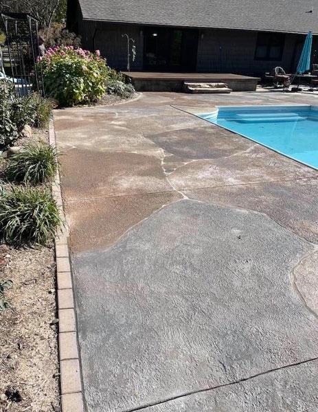 Decorative concrete overlays with many designs such as concrete wood, concrete pavers, tile designs, Knockdown texture patio, and other pool deck overlays.